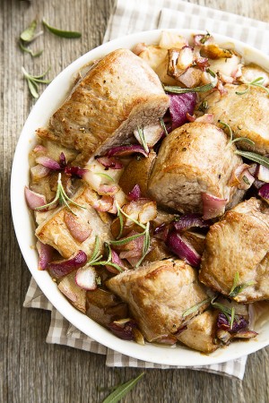 500 г свиной вырезки1/2 красной луковицы1-2 груши1 веточка розмарина (только листочки)расительное маслосоль, перецГруши нарезать небольшими кубиками, розмарин измельчить. Лук очистить и нарезать.Сви…